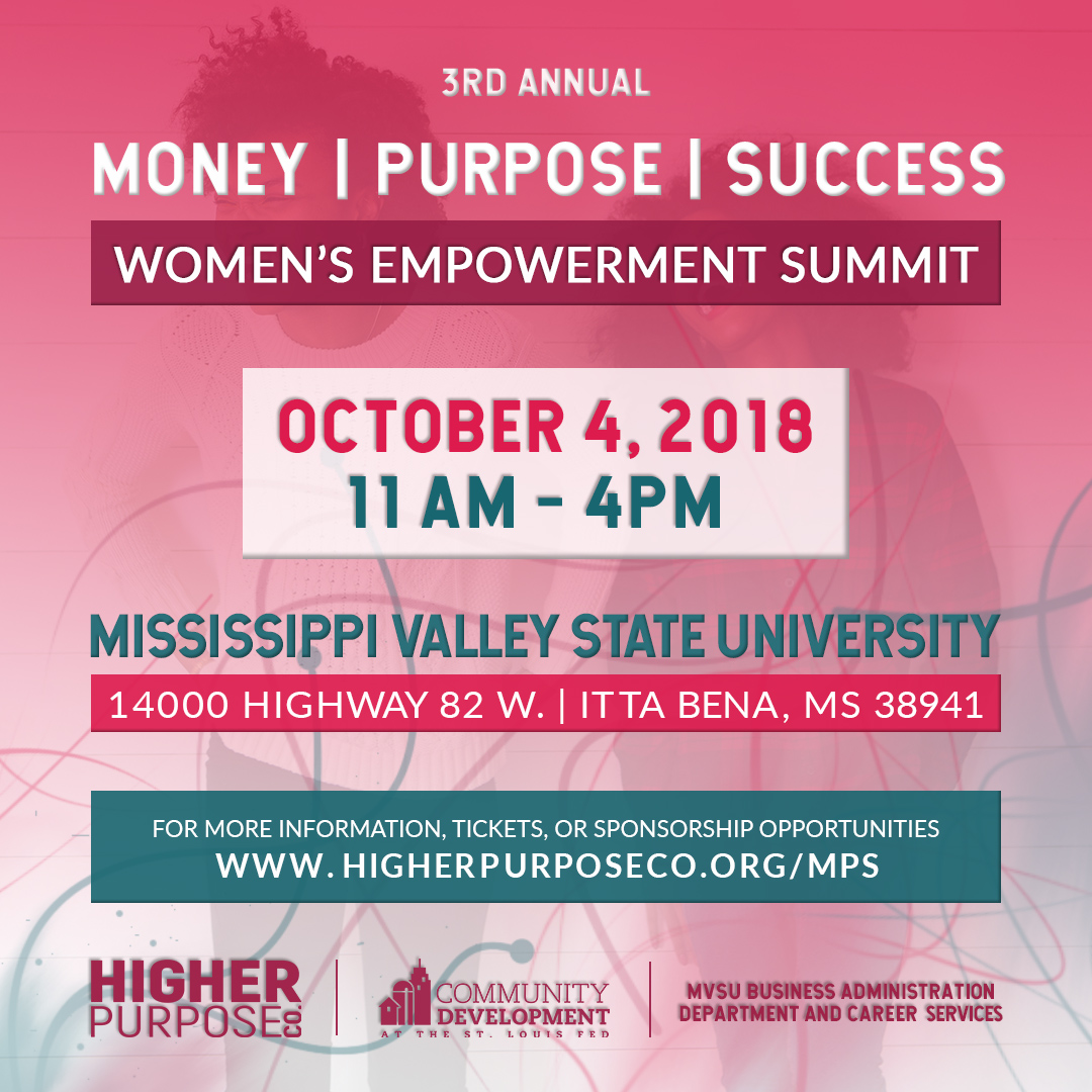 ITTA BENA, Miss.—Higher Purpose Co. is headed to Mississippi Valley State University Thursday, Oct. 4, to host its 3rd Annual #MoneyPurposeSuccess Women Empowerment Summit designed to help women entrepreneurs launch or elevate their business.
