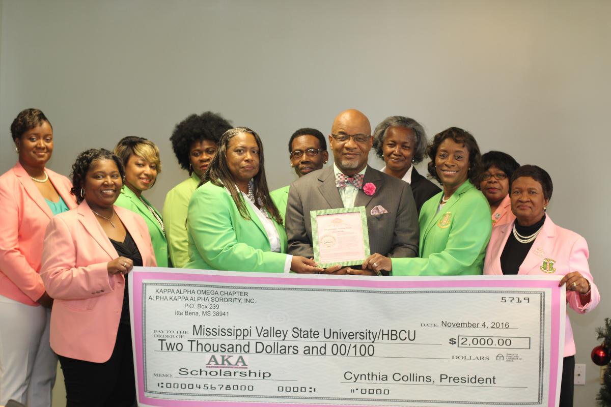 The Kappa Alpha Omega Chapter of Alpha Kappa Alpha Sorority, Inc. gifts a $2,000 donation to Mississippi Valley State University (MVSU) along with two $500 scholarships to MVSU students. The donation is a part of the sorority’s Think HBCU initiative. Think HBCU highlights Historically Black Colleges and Universities and their contribution to the sorority and society. Pictured front row, from left are Joyce Dixon, Cynthia Collins, president, Alpha Kappa Alpha – Kappa Alpha Omega Chapter; Dr. William B. Bynum Jr., president, MVSU; Maxcine Rush, Earnestine Singleton; second row, Auguster Wallace, Letitia Clay, Wanda Young, Barbara J.P. Washington, Claudette Curry, and Linda Course.