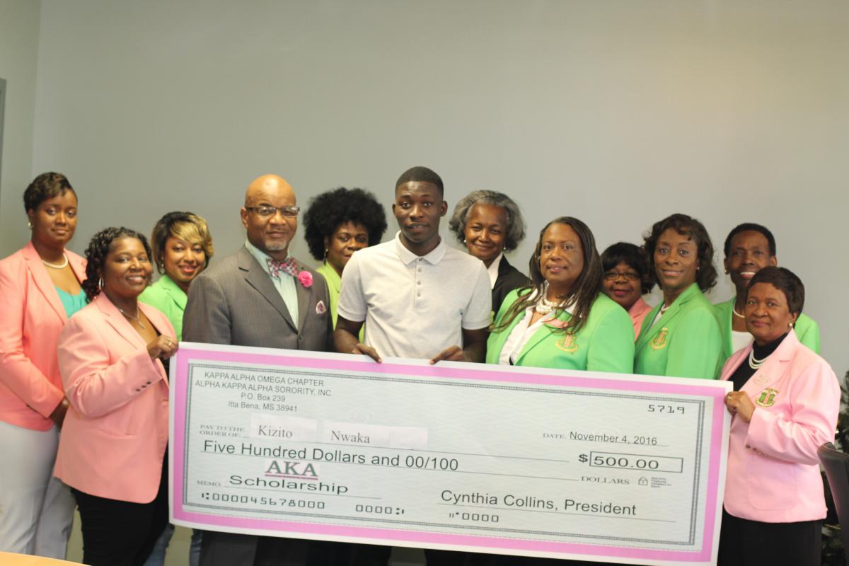 Sorority members present MVSU Student Kizito Nwaka with a $500 scholarship.