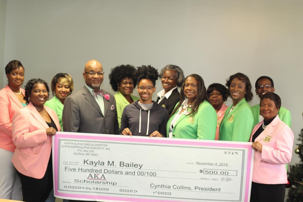 MVSU Student Kayla M. Bailey receives a $500 scholarship from the Kappa Alpha Omega Chapter of Alpha Kappa Alpha Sorority, Inc.