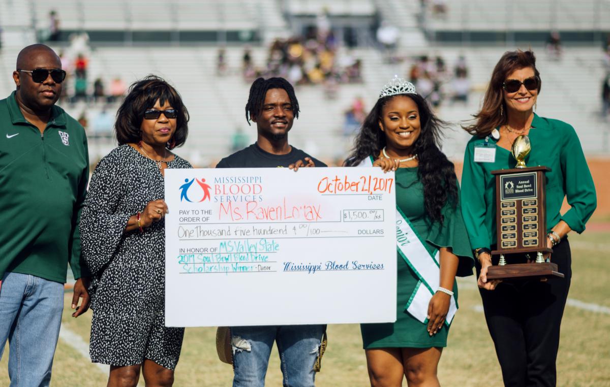 MVSU senior Raven Lomax of Southaven became the recipient of a $1,500 scholarship on behalf of Mississippi Blood Services (MBS) who also announced MVSU as the 2017 Soul Bowl Blood Drive winner.