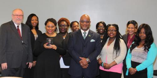 The Mississippi Valley State University Mock Trial Team ended the season competing in the Jackson Regional Mock Trial Tournament held at the Mississippi College School of Law in Jackson. Pictured from left are Dr. Larry Chappell, advisor; Jasmine Murphy, Dr. William Bynum, MVSU president; Kenya Junes, Alexxus Ervins; second row, Kambreca Mitchell, Barbara Duncan, Destaree Simmons, Laquita White and Neysha Sanders, Esq.
