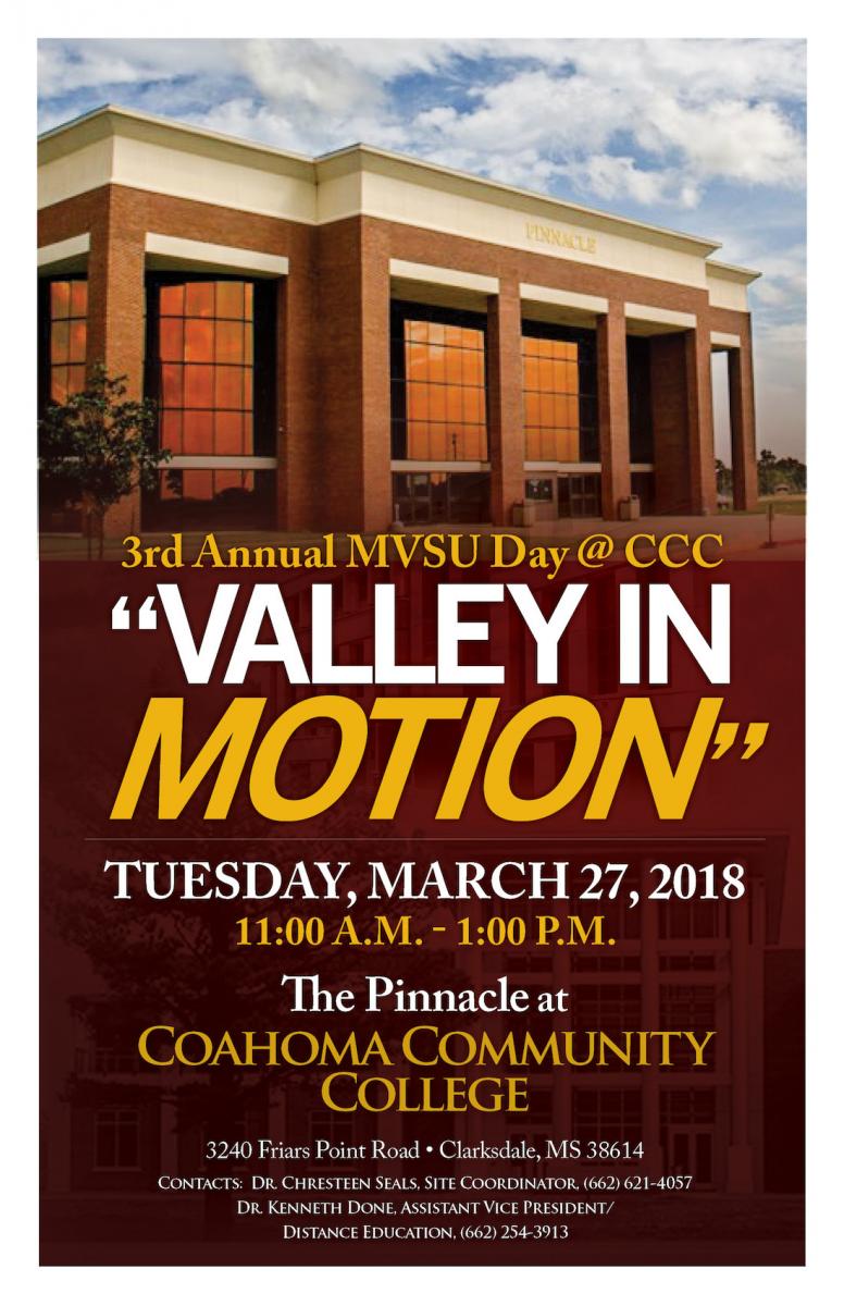 Themed "Valley in Motion at CCC", it will provide CCC students, MVSU students residing in the Coahoma area as well as interested community members the opportunity to learn more about a partnership between the two institutions that have brought MVSU courses to CCC's campus.