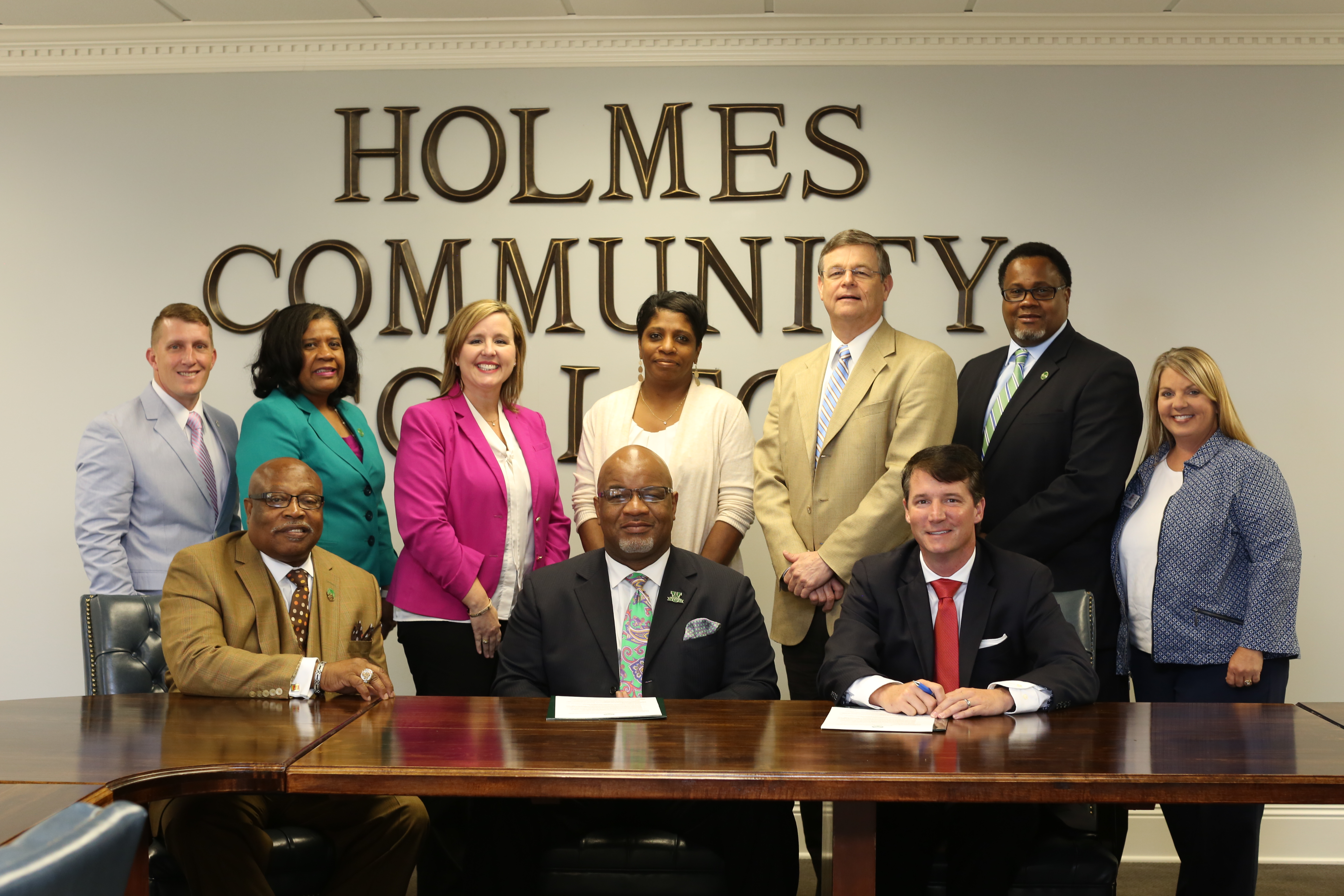 Pictured front row from left are Dr. Walter Roberts, HCC board of trustees vice-president and MVSU Foundation chairman; Dr. William Bynum, MVSU president; and Dr. Jim Haffey, HCC president; second row, Luke Jones, HCC director of career technical education, Goodman Campus; Dr. Constance Bland, vice president of academic affairs, MVSU; Michelle Burney, HCC vice-president, Grenada Campus; Dr. Sharon Freeman, assistant vice president of Institutional Research, MVSU; Dr. Don Burnham, HCC vice-president, Ridgeland Campus; Dr. Kenneth Done, assistant vice president/distance & online education, MVSU; Jenny Jone, HCC academic dean, Goodman Campus