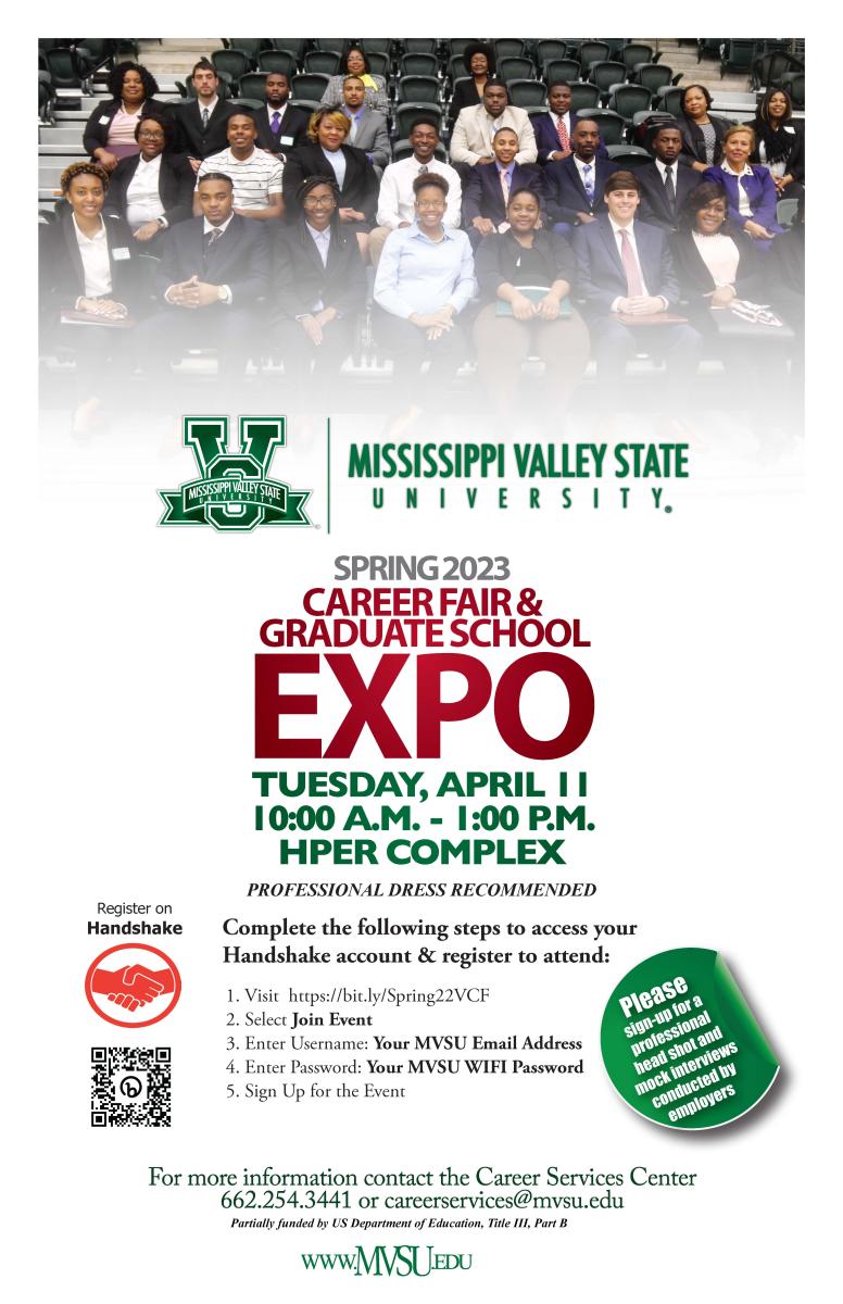 ITTA BENA, Miss- The Career Services Center at Mississippi Valley State University will host the 2023 Spring Career Fair from 10 a.m. to 1 p.m. Tuesday, April 11, 2023, in the R.W. Harrison Complex.