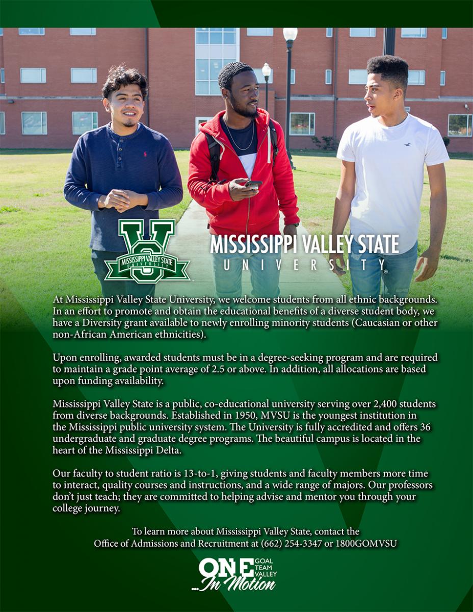 Scholarships and achievement grants are offered and awarded to deserving students based on scholastic merit and financial need as an integral part of the recipient's total financial aid package. The academic scholarship program at Mississippi Valley State University is designed to recognize and reward those students who have exemplified academic excellence. To demonstrate its commitment to talented students, the University annually awards a number of academic scholarships to qualified applicants. These scholarships are awarded on a competitive basis and are renewable at the end of each year for a four-year period for entering freshmen and a two-year period for junior college graduates. Policies concerning scholarships are determined by the department administering the scholarship.