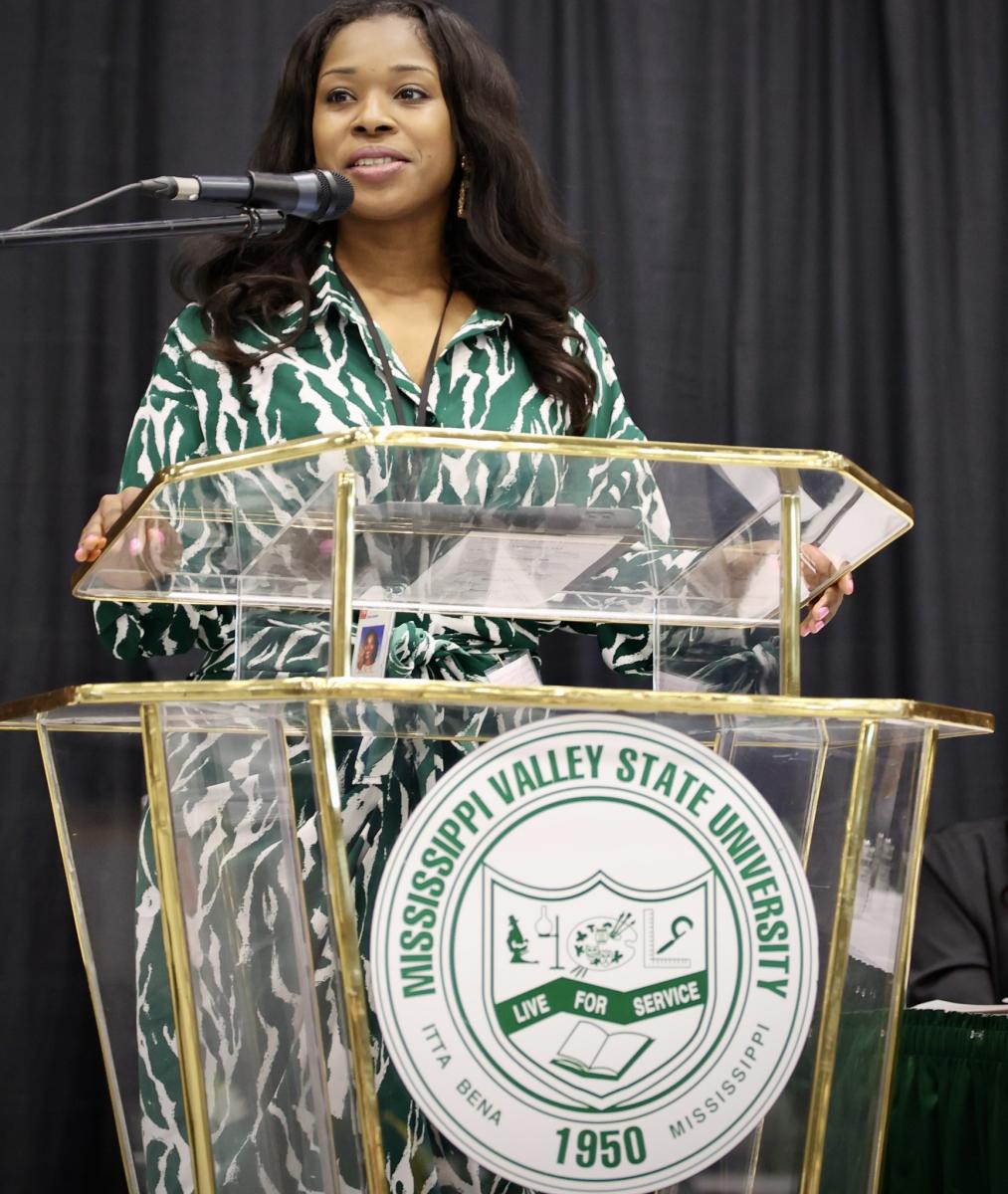 Ja’Mya Peoples, MVSU SGA Vice President, introduced the luncheon keynote speaker, Dr. Edrika Thigpen.